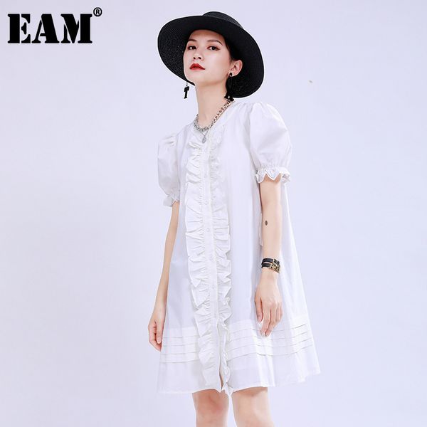 [eam] women white ruffles split joint temperament dress round neck short sleeve loose fit fashion spring summer 1w191 21512, Black;gray