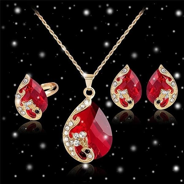 earrings & necklace trendy jewelry set crystal peacock bride wedding ring top, Silver