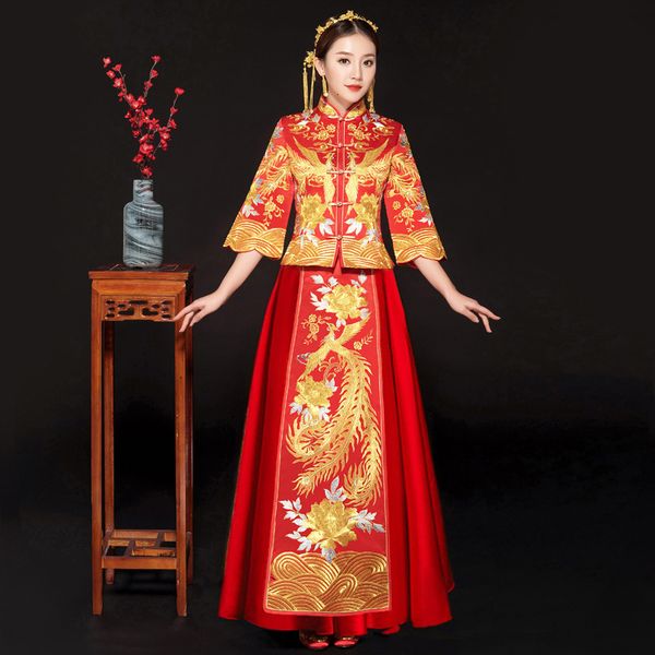 east asian bride chinese traditional women red blossoms cheongsam tissue long qipao style dfw2, Blue;red