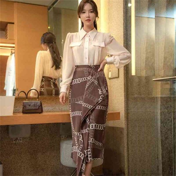 elegant ol 2 piece set women lapel lantern sleeve white chiffon shirt + high waist irregular print bodycon long skirt suits 210602