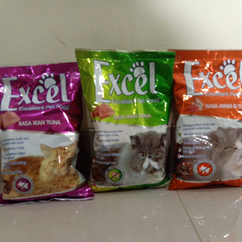 makanan kucing merk excel rasa tuna dengan kemasan ekonomis repack 500 gr