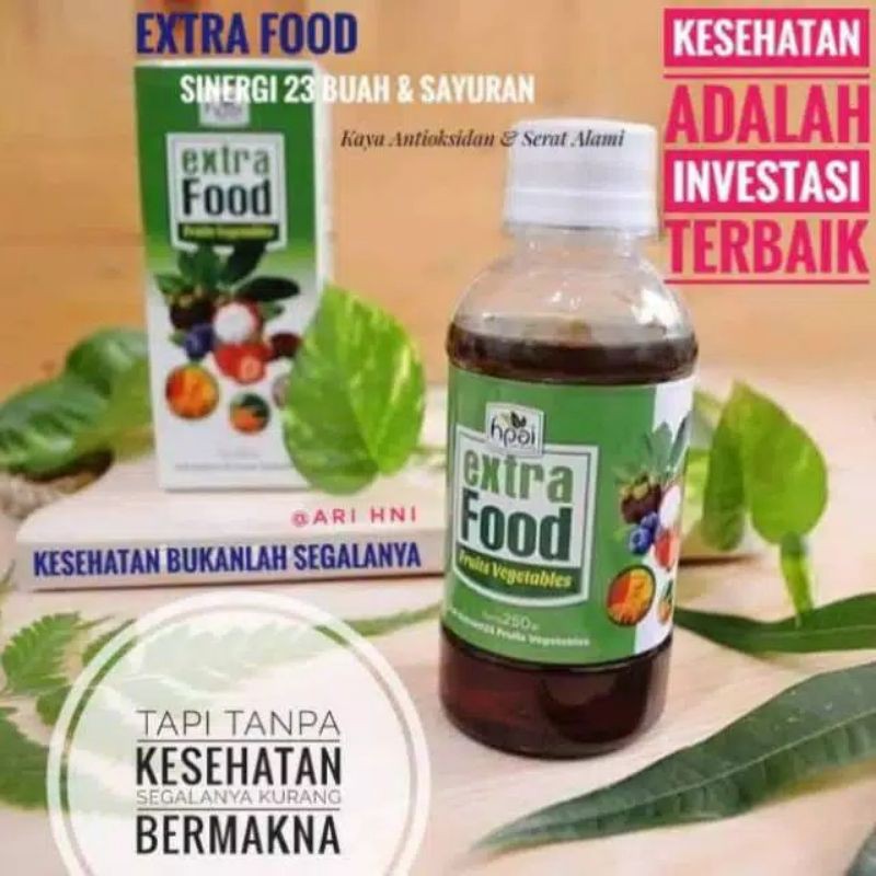 Extra Food HPAI, adalah makanan kesehatan alami yang dibuat dari sinergi 23 herbal buah-buahan dan sayuran yang kaya akan antioksidan & serat alami. Extra Food HPAI diformulasikan sebagai makanan suplemen herba yang berkhasiat untuk mengatasi berbagai penyakit dan bermanfaat bagi kesehatan tubuh. Dengan mengkonsumsi Extra Food HPAI ini akan memberikan perlindungan Anda dan keluarga dari RADIKAL BEBAS.