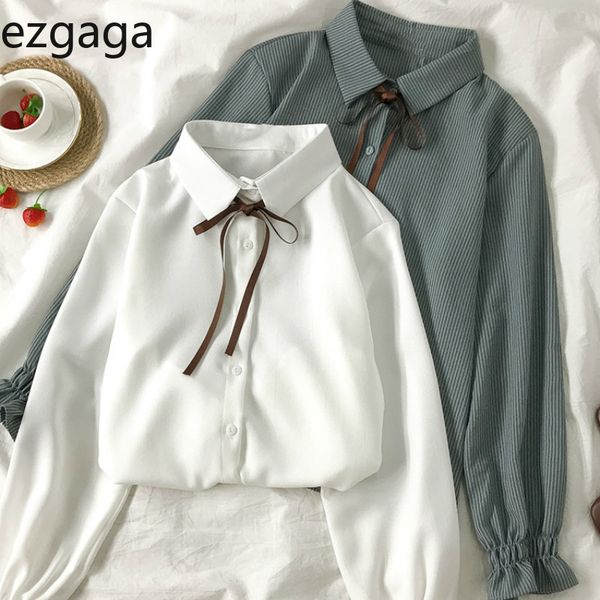 ezgaga girls blouse autumn winter korea preppy style female solid turn-down collar flare sleeve shirt outwear fashion elegant 210430, White