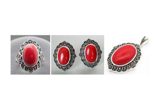 fashion designed red carved marcasite lacquer silver silver ring earrings and pendant jewelry sets, Black