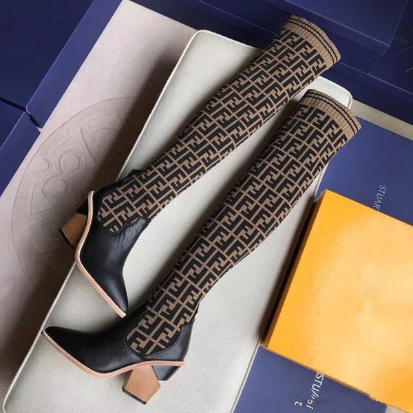 fashion luxury designer women high heel stretch-knit sock boots 22 inches over the knee boots f breathable elastic ladies winter boots, Black