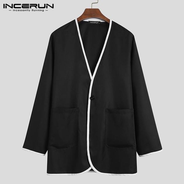 fashion men casual shirt v neck button loose korean patchwork camisas long sleeve pockets streetwear mens shirts men's, White;black