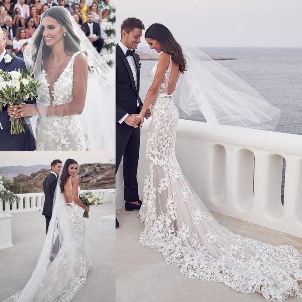 fashion mermaid backless wedding dresses sheer deep v neck appliqued beaded beach bridal gowns tulle sweep train robes de mariée, White