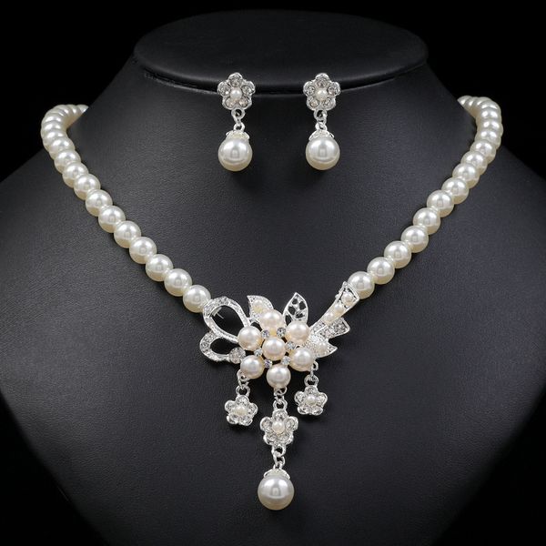 fashion pearl flower necklace earrings set women's jewelry alloy plating 092, Silver