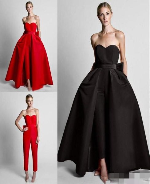 fashion red detachable train evening prom dresses jumpsuits bows sweetheart simple satin pants suits whole zuhair murad5548828, Black;red