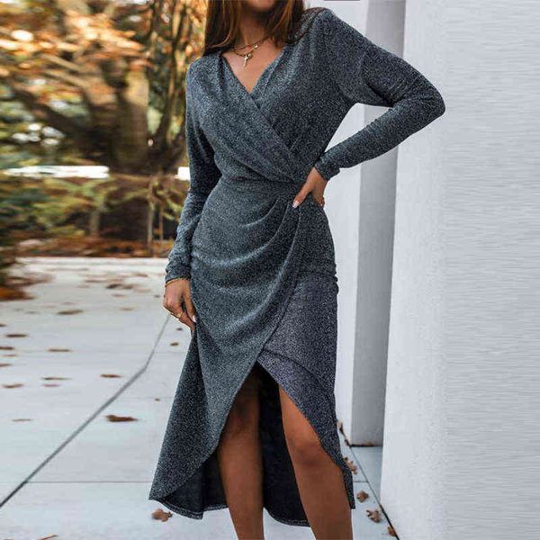 fashion silk shiny sequin women dress spring autumn caual long sleeve maxi dress lady v neck wrap split solid party dress y1204, Black;gray