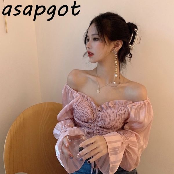 fashion slim pink slash neck blouse flare sleeve pleated drawstring lace up blusas de mujer korean women clothing 210429, White