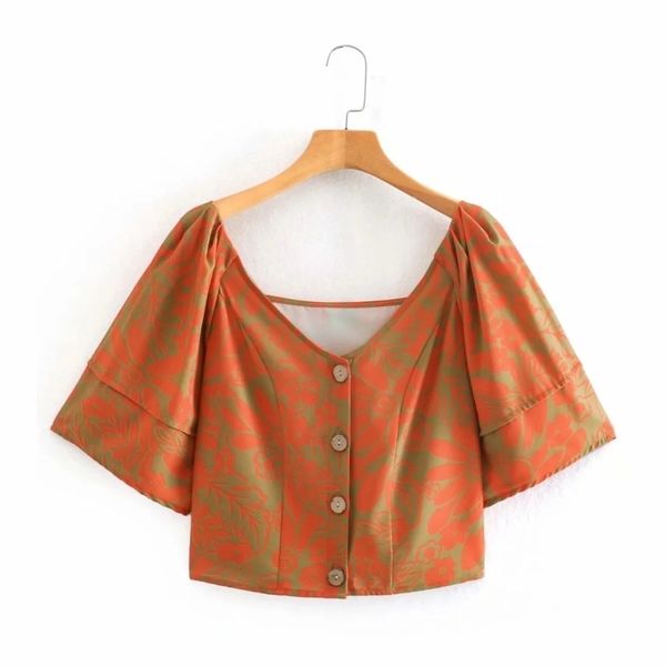 fashion women digital print v neck puff sleeve short shirt female single breasted blouse lady crop blusas s8586 210430, White
