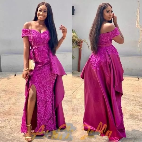 fuchsia lace african evening dresses with overskirt off shoulder stain slit peplum full length plus size prom party gowns, Black;red