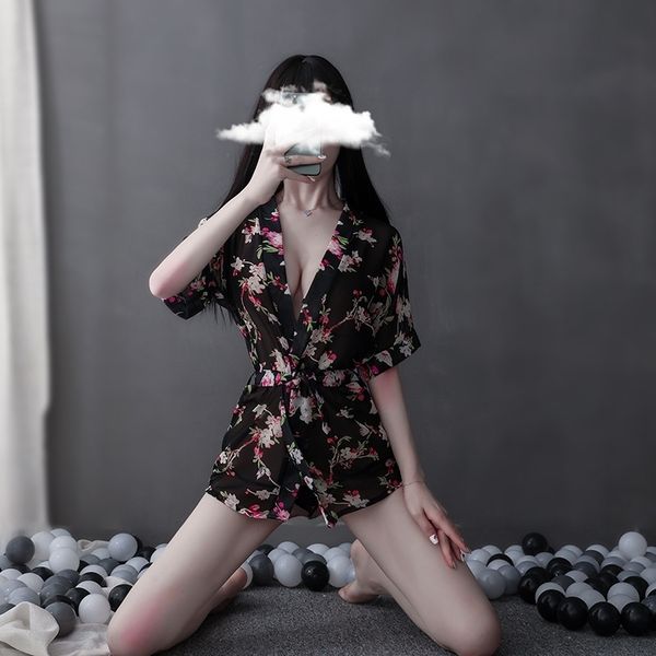 fyuy lingerie ladies pajamas transparent chiffon printed kimono uniform women's underwear seductive underwear bathrobepajama bath, Red;black