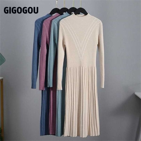 gigogou chic long knit maxi women sweater dress thick warm winter pleated female rib turtleneck a line office lady 211109, Black;gray