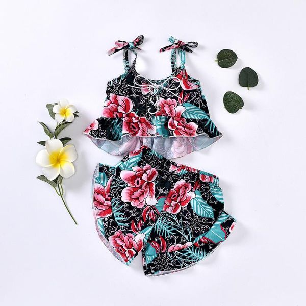 girl's flower plant drawstring sling printed blouse + shorts two-piece suit baby girl clothes ropa niña meisjes kleding clothing sets, White