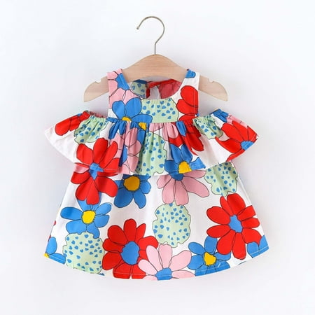 Toddler Dress Summer Toddler Baby Girls Floral Print Cotton Dress Ruffled Drop Shoulder Dress
