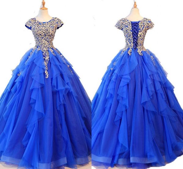 gold blue ruffles sweet 16 dresses 30d floral applique beaded short sleeve tulle prom dress ball gowns quinceanera dress for 15 years girls, Blue;red