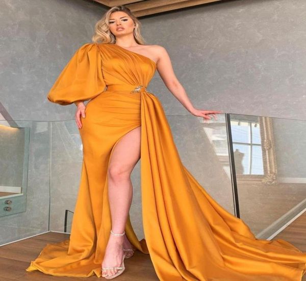 gold plus size arabic aso ebi one shoulder prom dresses high side split floor length satin formal evening dress party wear se2470189, Black