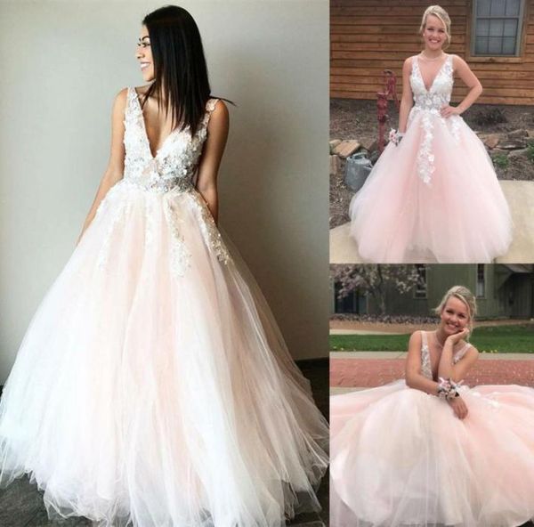 gorgeous appliqued floral tulle prom dresses deep v neck sheer straps floor length backless evening dresses plus size ball gown8063535, Black