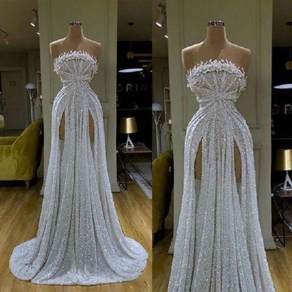 gorgeous white sequind prom dresses strapless high split evening gowns floor length backless robes de mariée, Black
