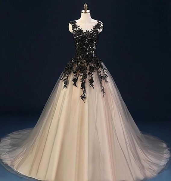 gothic champagne and black ball gown wedding dresses sheer neck sleeveless lace appliques tulle corset bridal gowns with court tra1952721, White