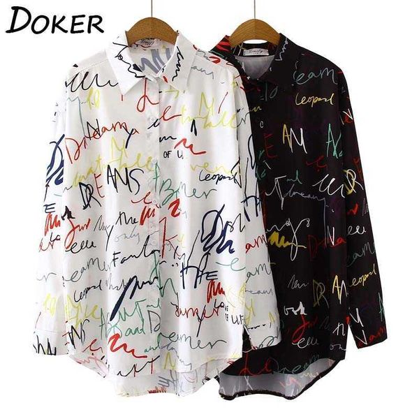 graffiti print blouse women autumn turn-down collar long sleeve plus size office elegant ladies shirts casual and blouses 210708, White