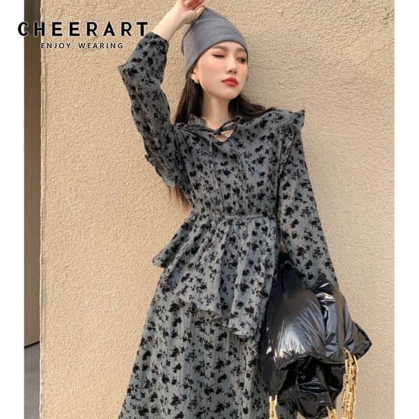 grey ruffle floral long sleeve ruched asymmetrical dress women tie neck tunic midi korean fashion clothing 210427, Black;gray