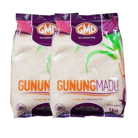 Gula GMP kemasan ukuran 1 kg, cocok sebagai bahan pemanis dan penyedap untuk makanan, kue, dan sajian lainnya.