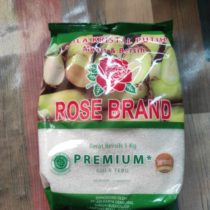 gula kemasan 1kg merk rose brand.. kemasan hijau dan kuning...