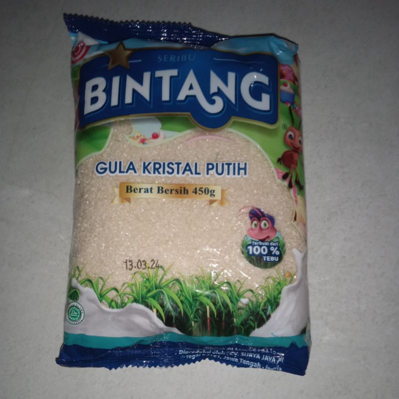 Gula pasir putih kemasan merk BINTANG 450 gram.