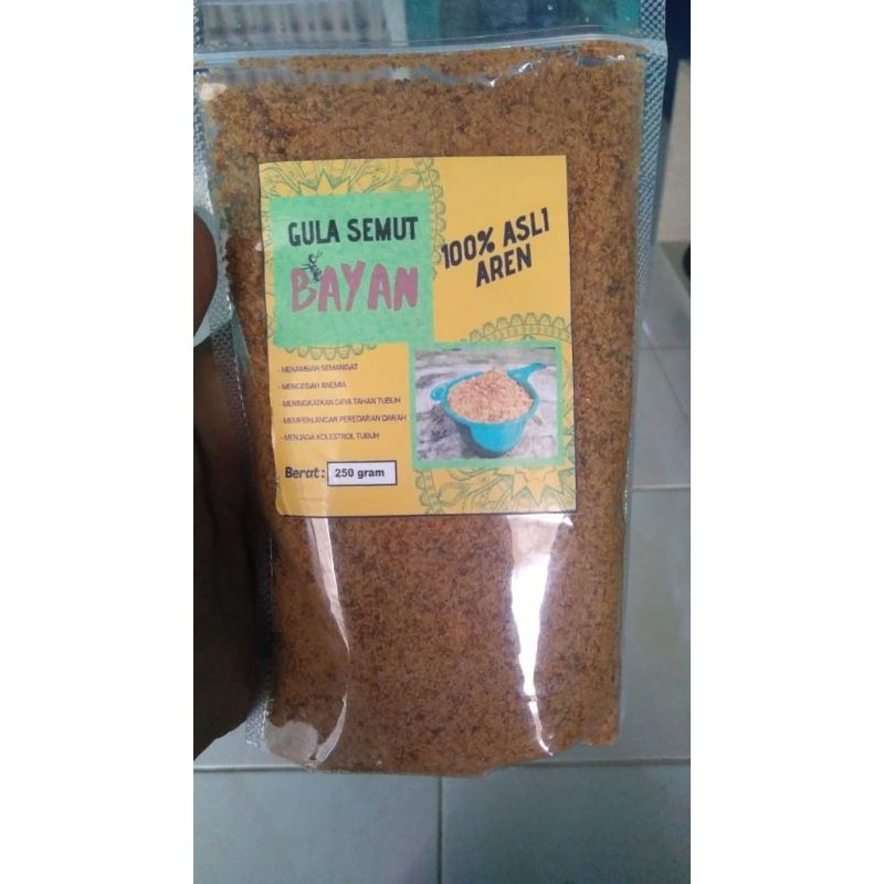 gula semut terbuat dari aren asli diolah dengan baik. bisa disajikan untuk campuran kopi,kue atau olahan makanan lainnya. kemasan 250gram