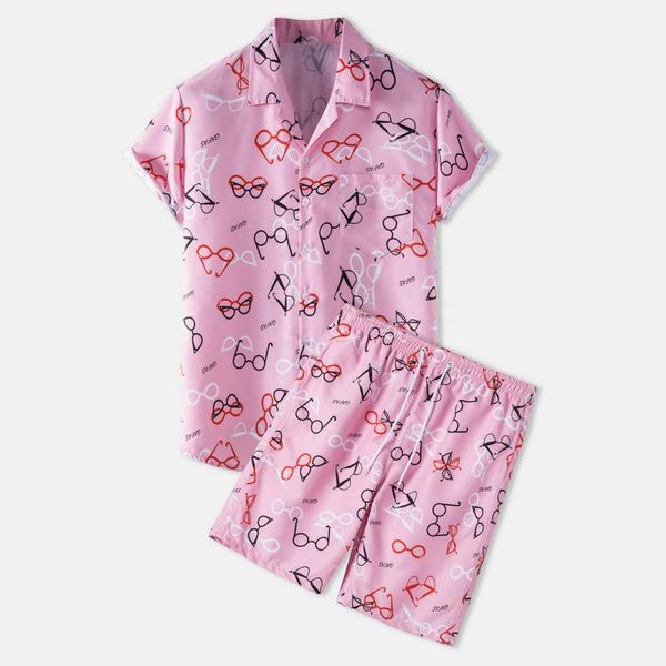 gym clothing men's short-sleeved suit summer 2-piece set beach print casual shirt and short pants, White;black