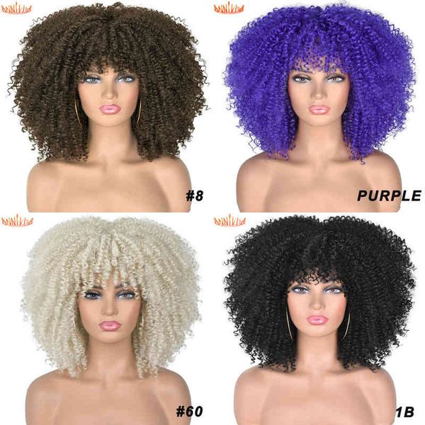 hair short afro kinky curly with bangs for black women african synthetic ombre glueless cosplay high temperature 14" 220301, Black;brown