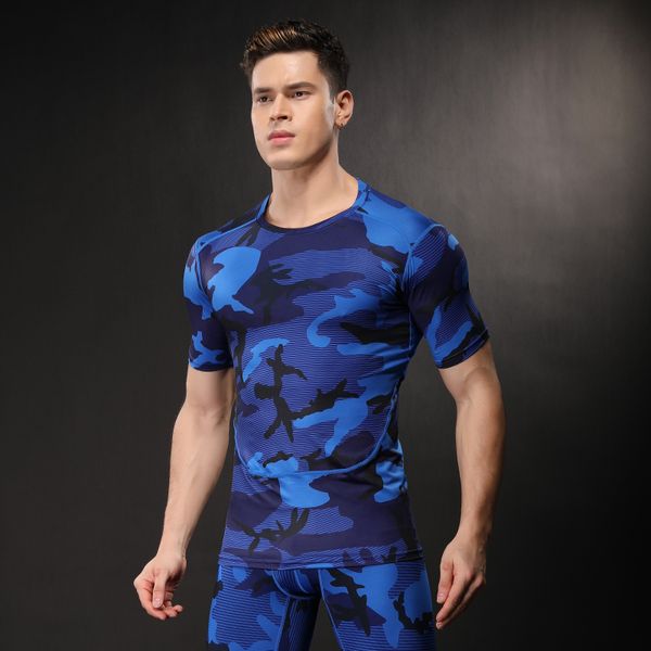 hamek men camouflage sports t-shirt fitness gym running tights basketball quick dry compression under shirts for workout yoga, Black;blue