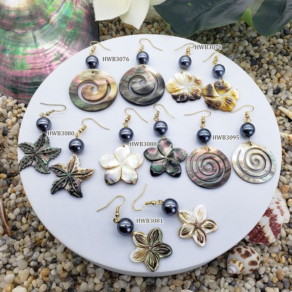 these beautiful earrings feature a carved black mother of pearl shell flower the shells are then polished to a high gloss to reveal the beauty of their natural pattern.enjoy these lightweight beauties that are so easy to wear this will make a perfect addition to your island themed collection, or as a wonderful gift for those who love hawaii.syi