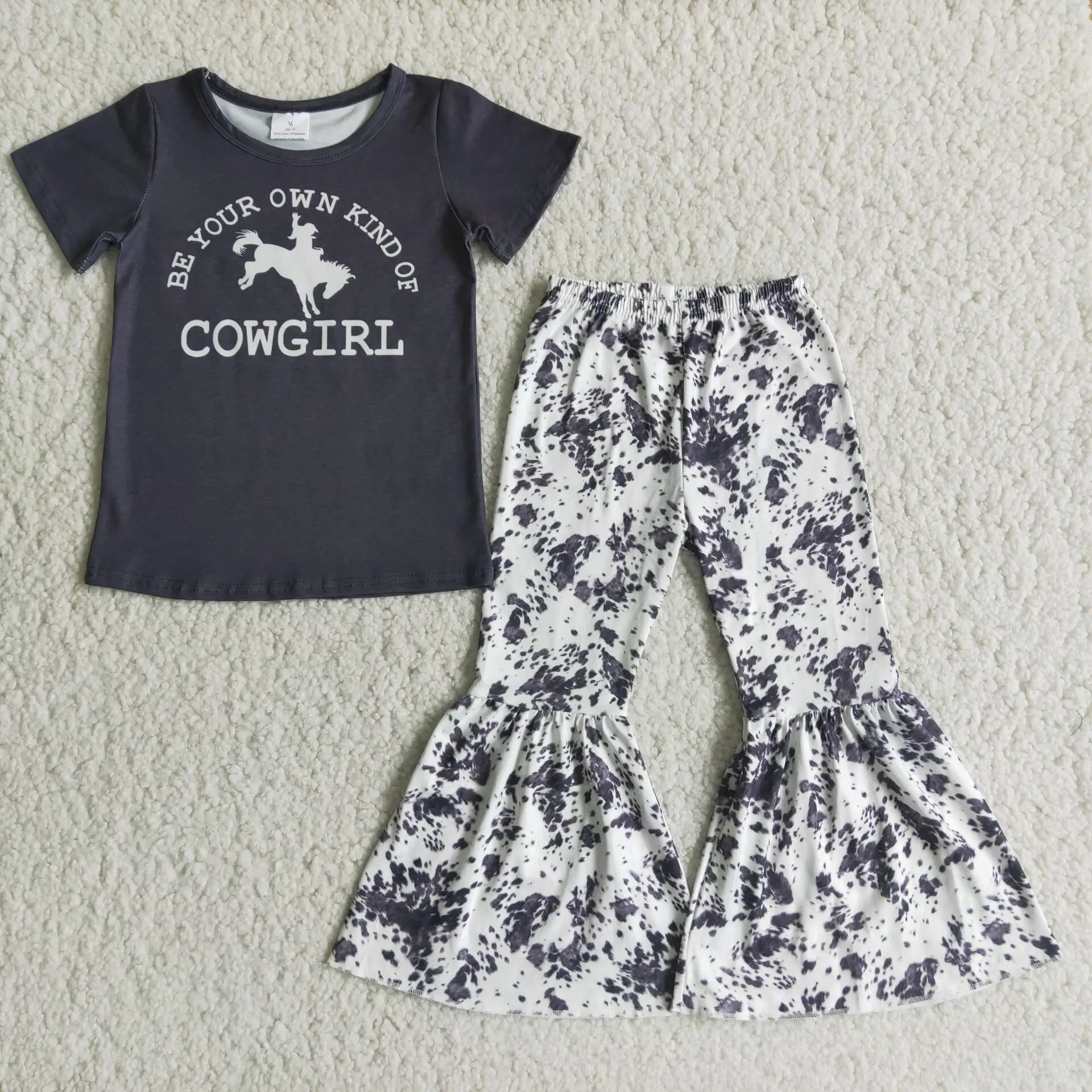 Rts No moq Baby girls Cowgirl Screen Print Outfits Short Sleeves Top Bell Bottom Pants Kids Children Clothing Wholesale Sets