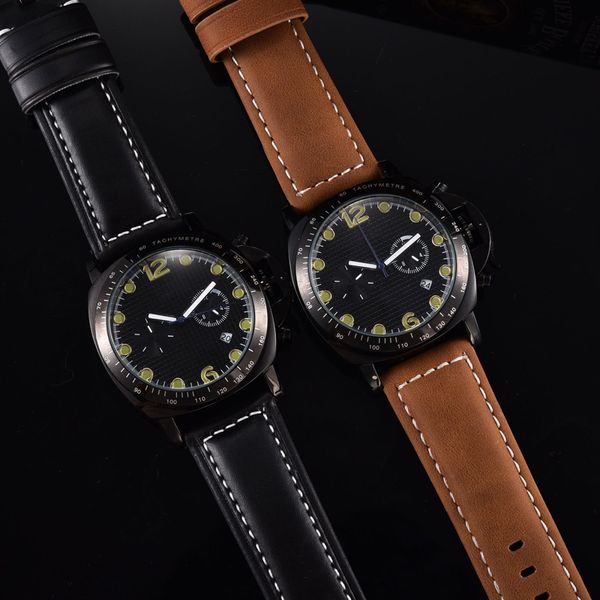 high-end sports men's watch trend wild six-handed running seconds quartz waterproof super luminous cowhide strap 45mm, Slivery;brown