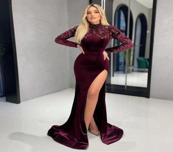 high neck long sleeves velvet mermaid evening dresses side split sweep train beaded appliques formal prom party gowns2983792, Black;red
