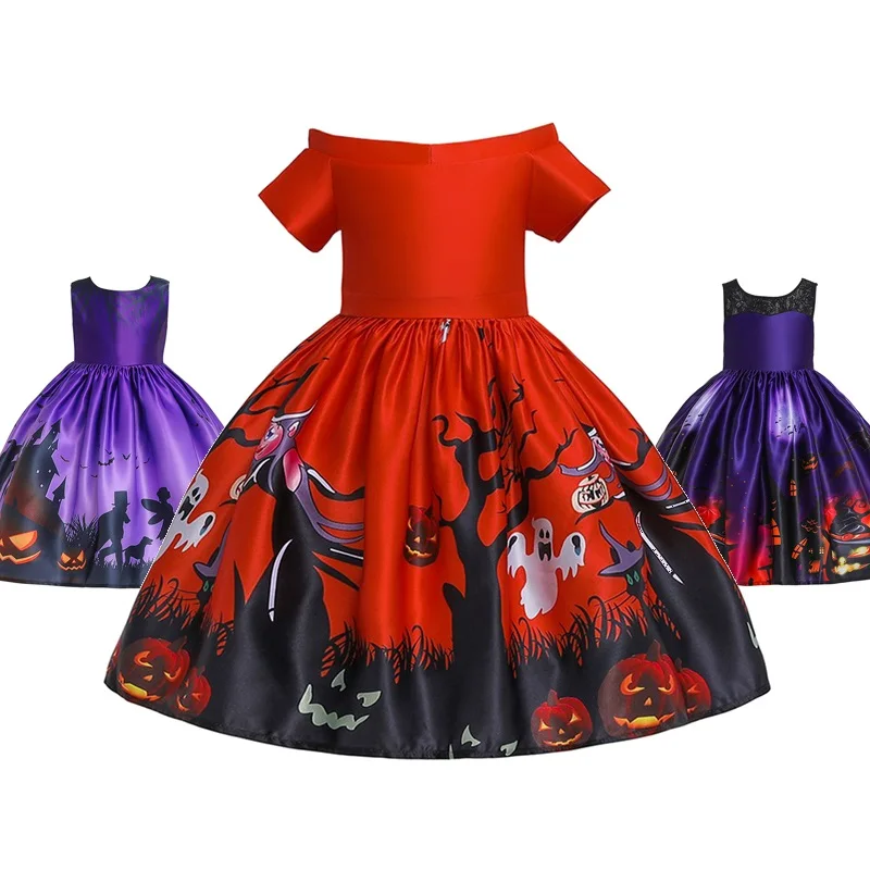 VOGUEON Girls Princess Party Dress Halloween Witch Pumpkin Bat Printed Swing Ball Gown Children Ruched Outfit Clothes for 2-10T