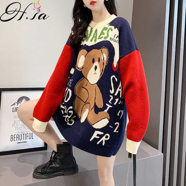 hsa bear sweater women's loose outer wear mid-length korean style autumn and winter thickening lazy pullover sweater 210716, White;black