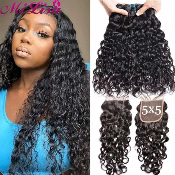 human hair bulks water wave bundles with closure 30 inch wet and wavy natural remy extensions 5x5 lace, Black