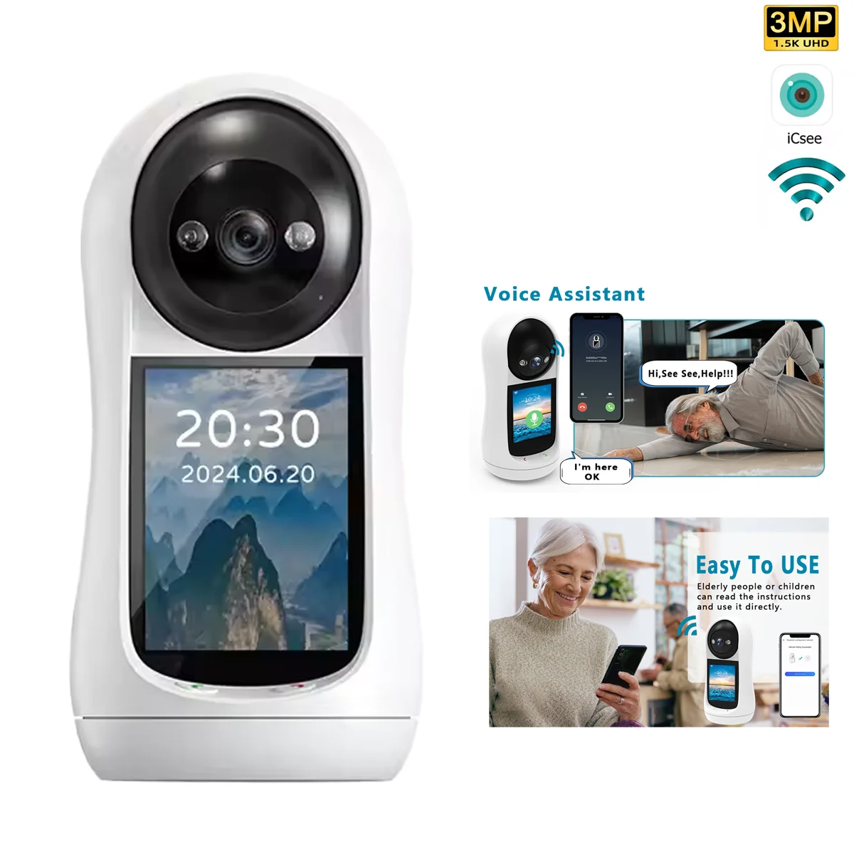 iCSee Smart Home Camera: 3MP HD, Voice Assistant, Cry Detection Alarm, Two-Way Audio, 360° View, Night Vision, Cloud Storage