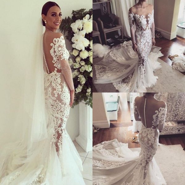 illusion lace mermaid wedding dresses bridal gowns with long sleeves sheer neckline backless vestidos de novia trumpet court train, White