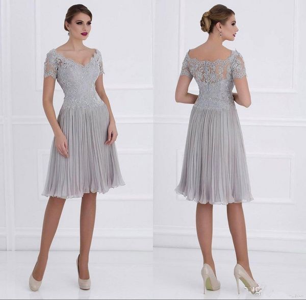 illusion mother of bride dresses short sleeve knee length silver lace appliques chiffon evening dress mother dresses for wedding, Black;red
