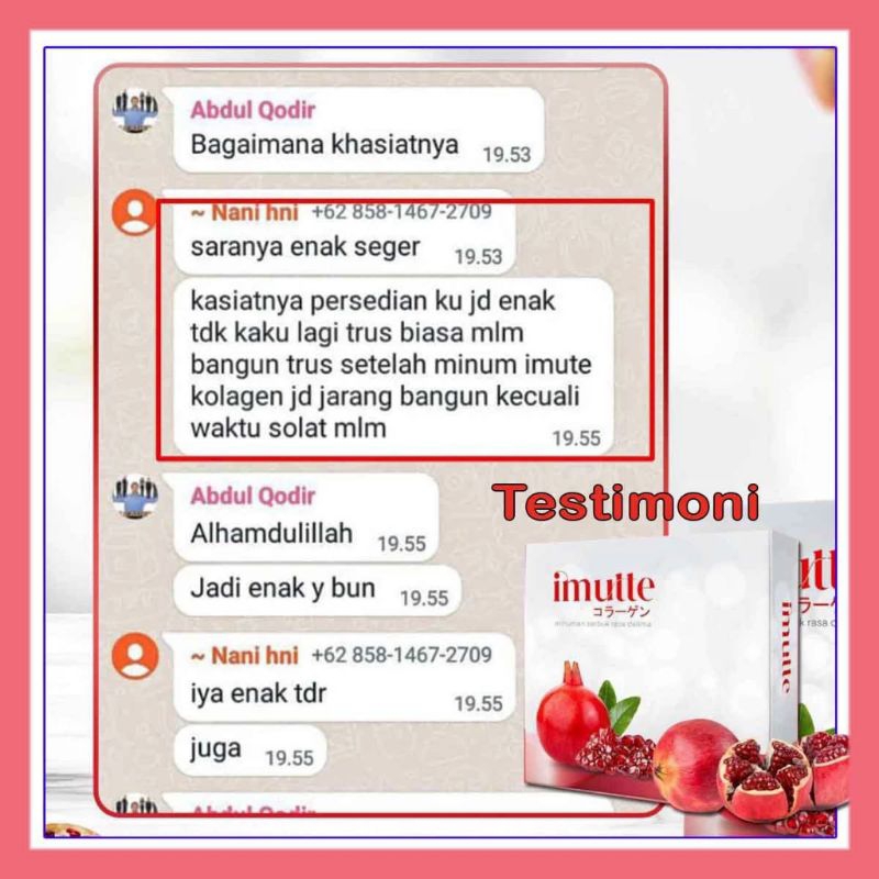 Dengan kandungan dari bahan-bahan pilihan berkualitas, Imutte Kolagen tidak hanya berfungsi untuk kecantikan kulit dan wajah. Tetapi juga mampu mengatasi berbagai masalah kesehatan. Sehingga bisa di konsumsi wanita dan pria.