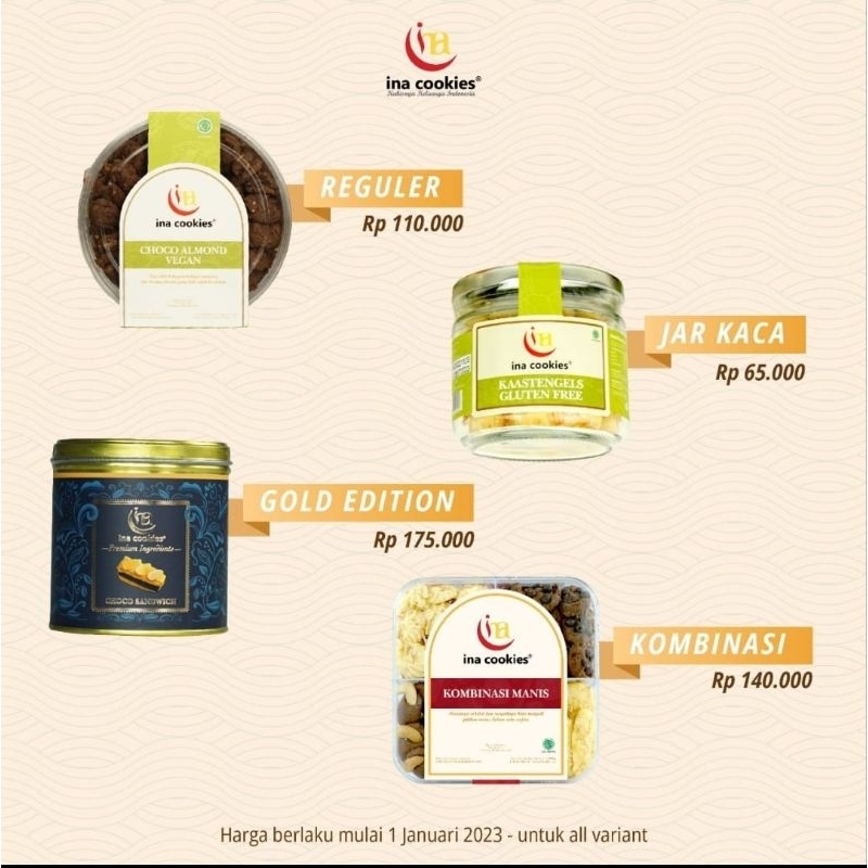 Harga 65.000 -140.000/toples 100% original Ina Cookies , semua agen harganya sama.