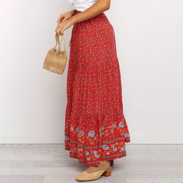 ins new european and american retro print skirt womens elastic high waist lace-up pleated a- line skirt amazon sale