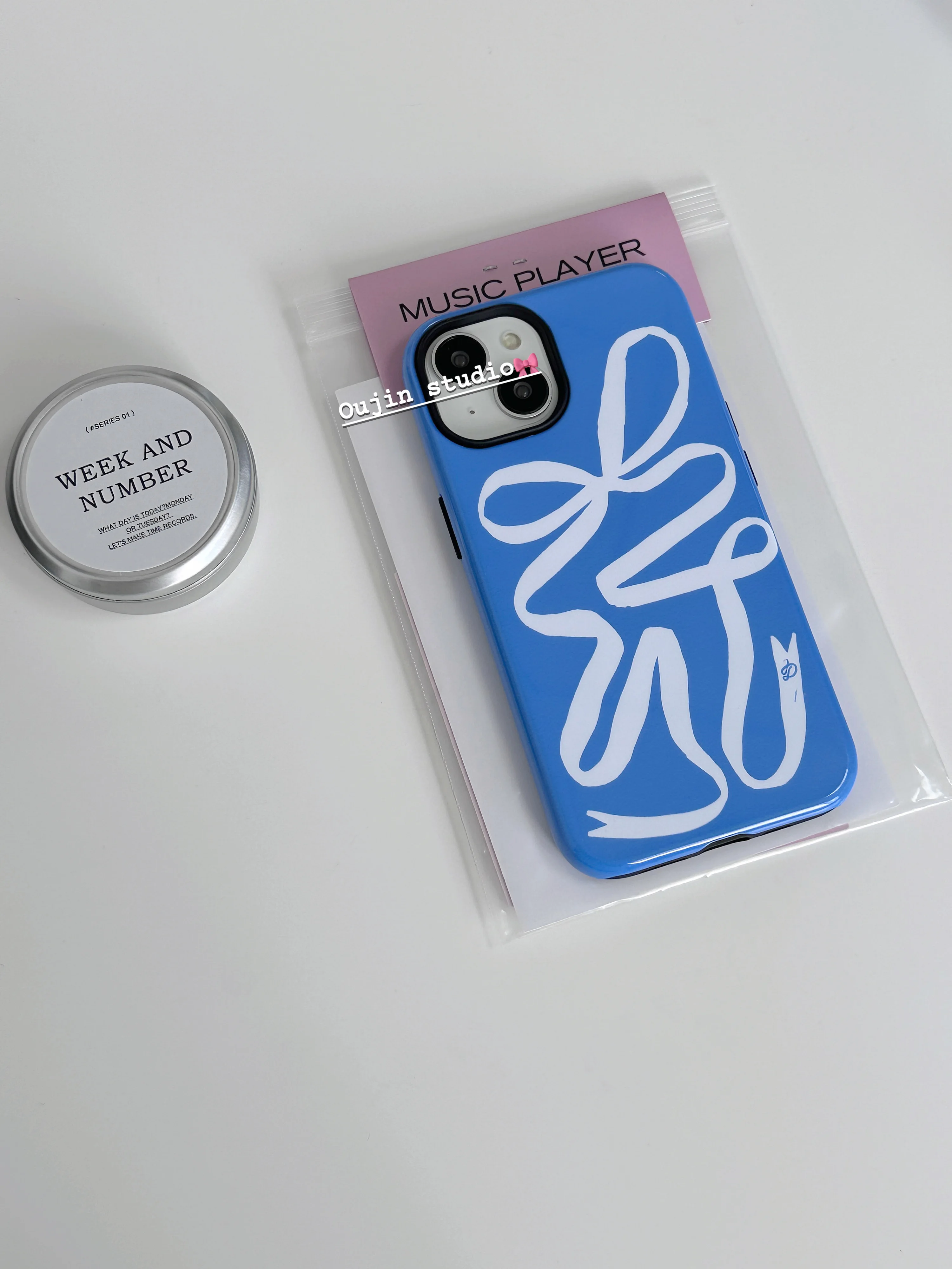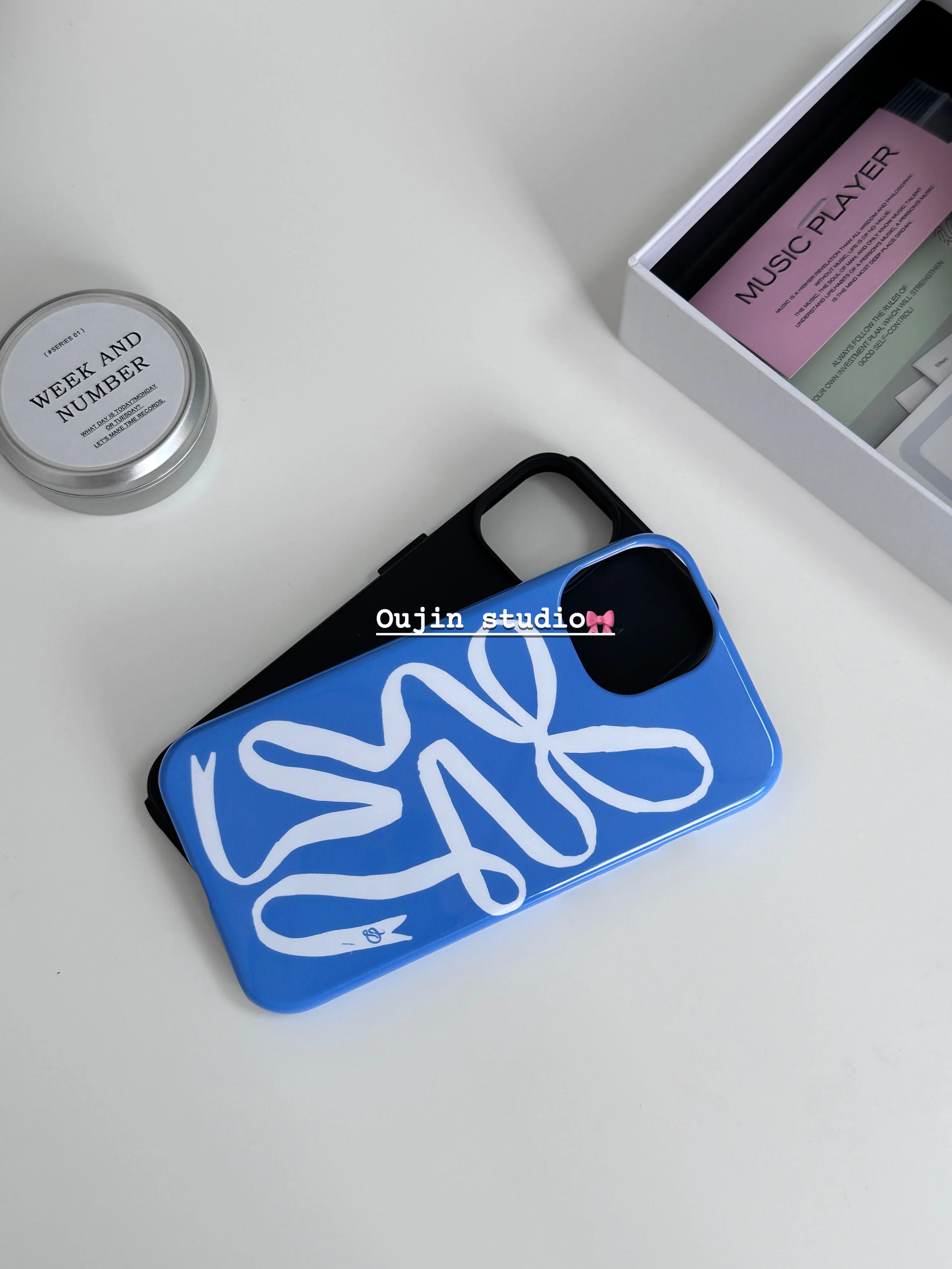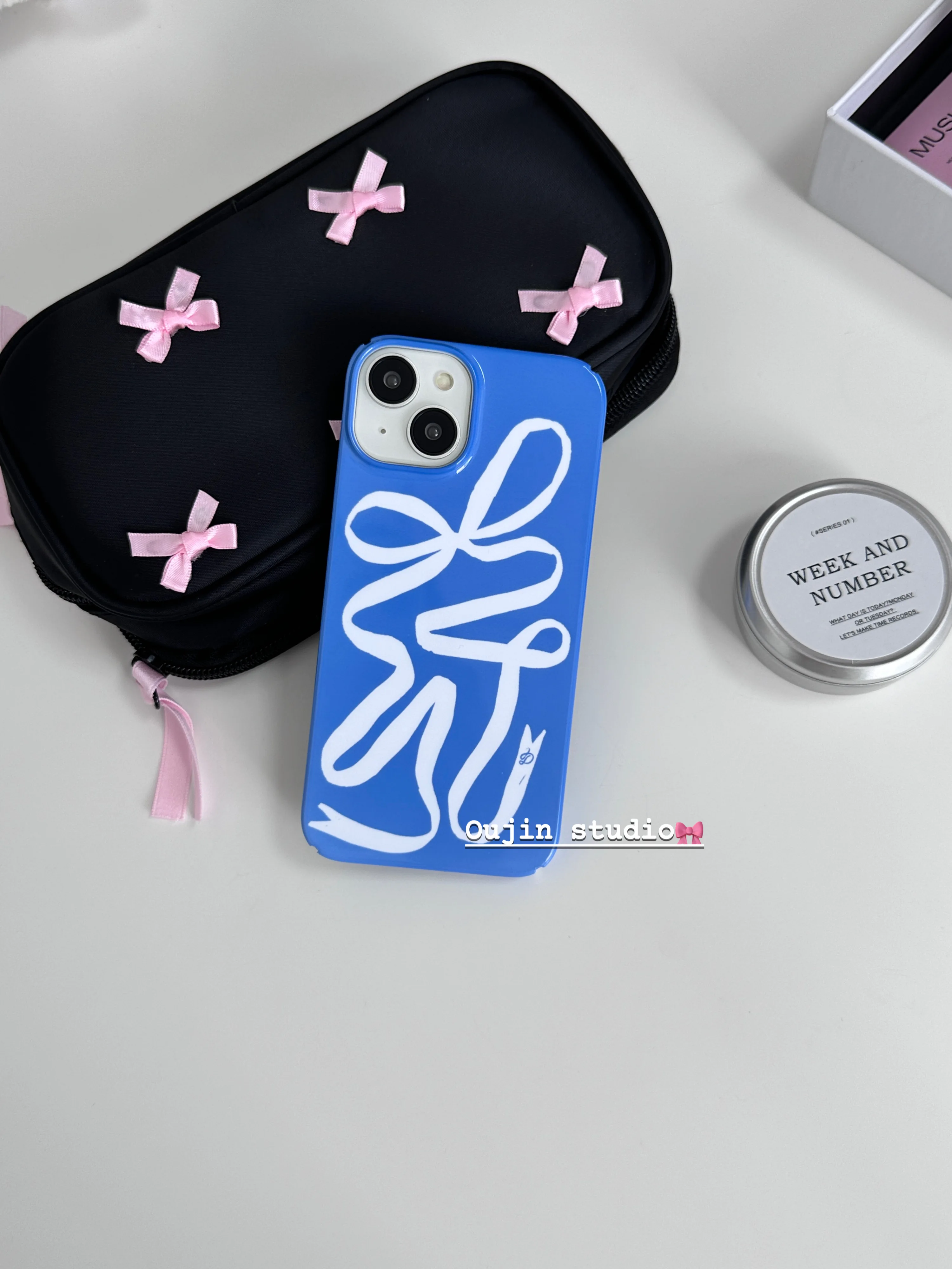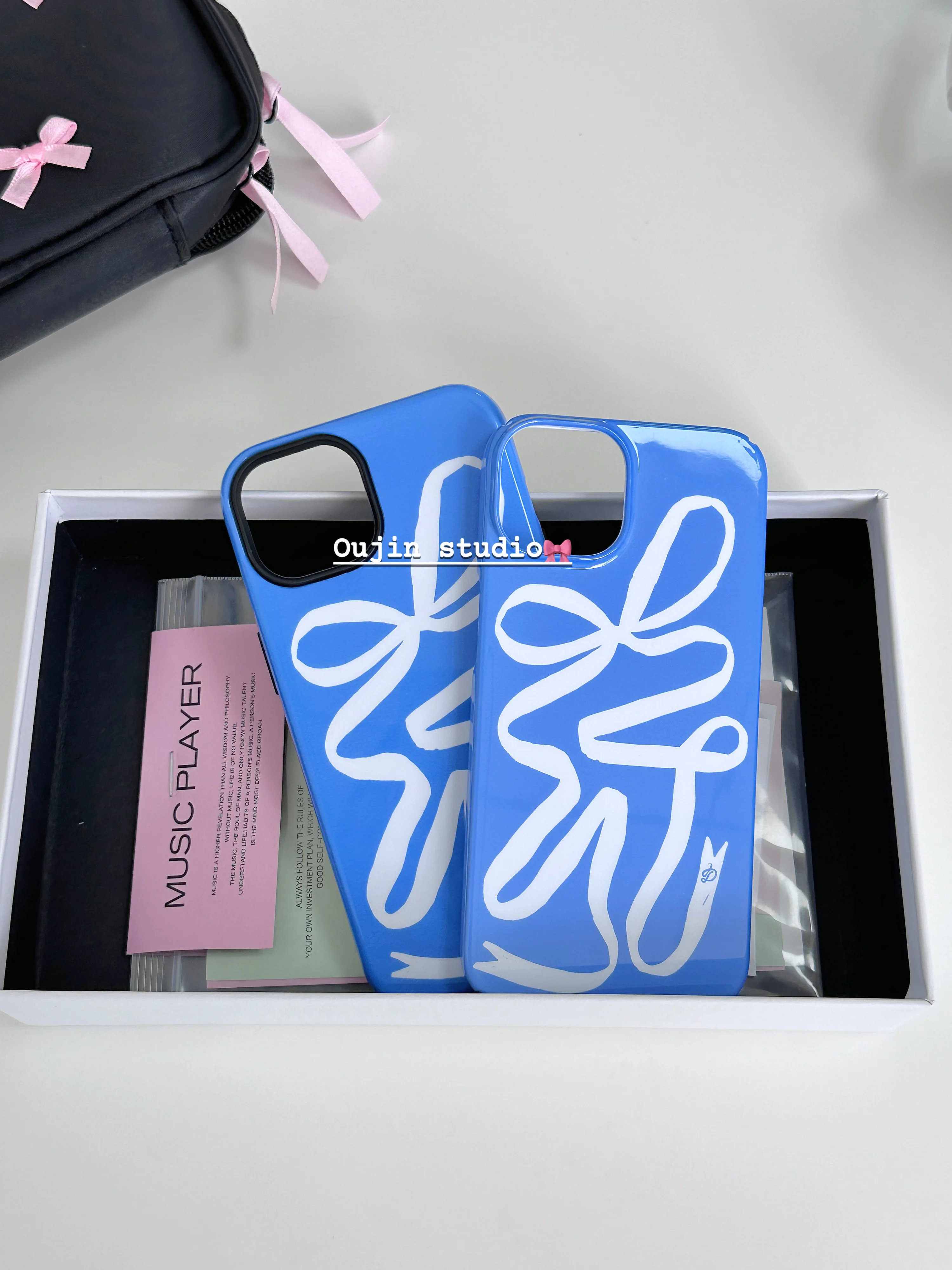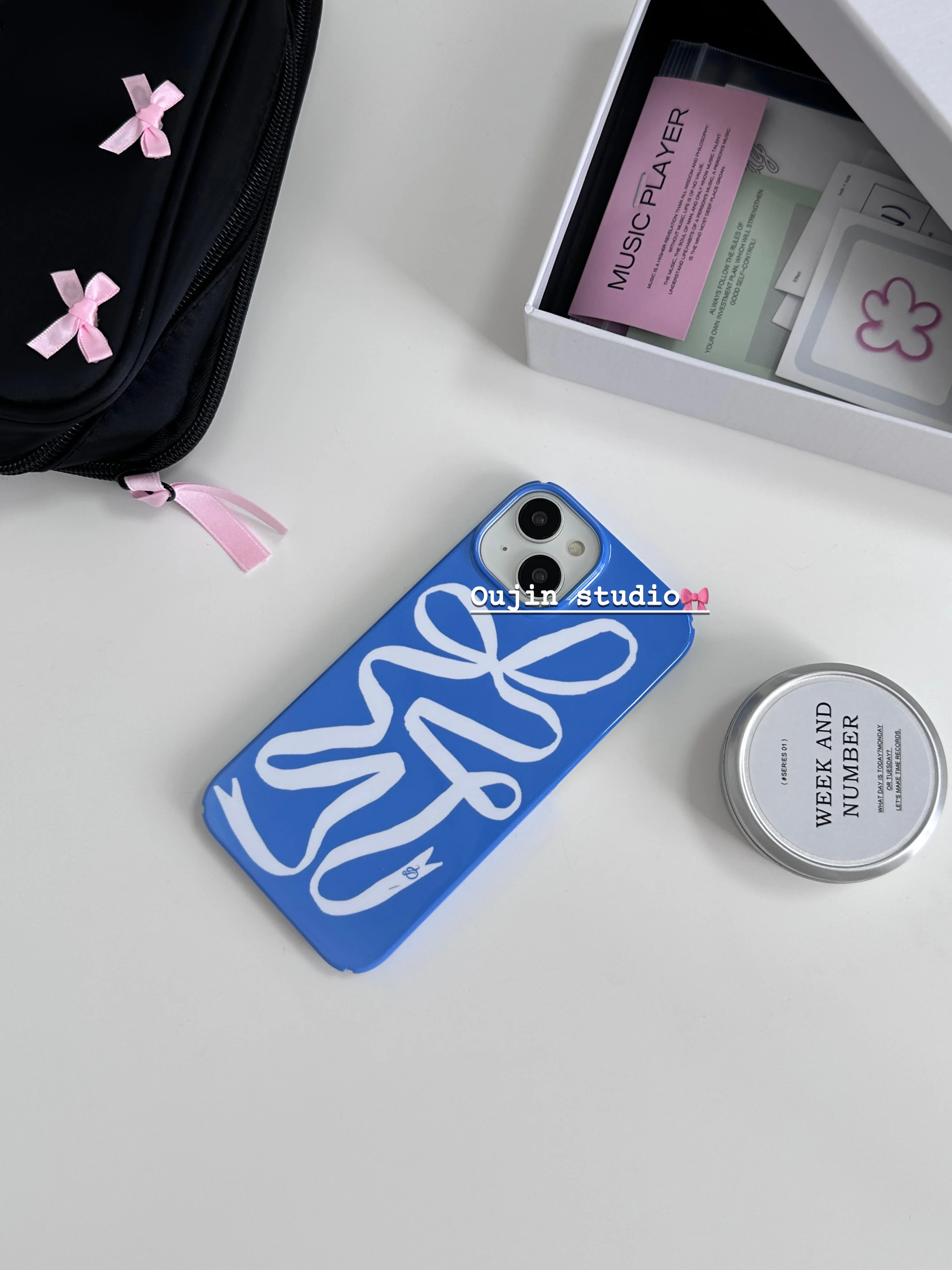 ins Niche Design Creative Blue Art Ribbon White Bow Film hard case for 15pro/14promax/13/12/11 phone case protective case agains