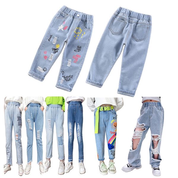jeans kids girl floral cartoon long pants spring autumn graffiti painting print casual denims short trousers with hole 220923, Blue